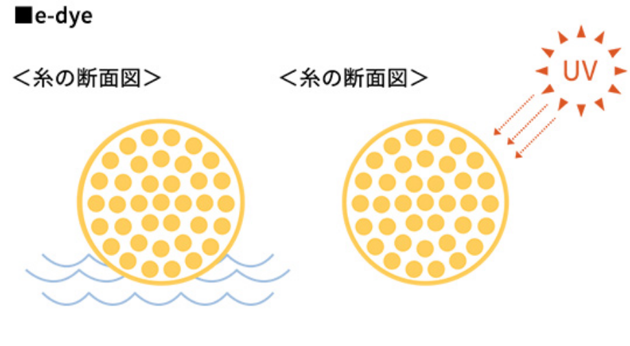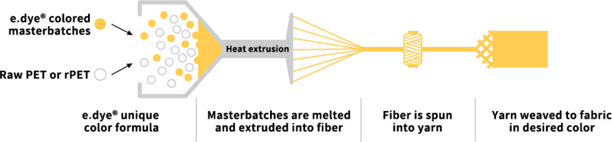 染色(着色)段階で水は使いません。製糸工程前の原料に着色する革新的な染色方法です。車のファブリックスなどの大量生産型に一般的に使われる技術ですが、e.dyeの技術では3,000m/colから可能です。この“原着”技術は、顔料を繊維自体に練り込むため、その発色性や安定性に優れ、一般の染色よりも耐光をはじめ各種堅牢度が高い点がメリットです。また、この原着技術は一般的な水を大量に使用する染色工程が不要となることから、環境負荷の低い着色方法ともいえます。その背景から、“無水染色”という表現を昨今はされることもあり、環境配慮型の技術として、注目されています。この技術では、紡糸段階からの着色となるため、紡糸製造工程が大掛かりとなり、どうしても製造ロットが大きくなると言う背景から、繊維・アパレル業界を始めとして、これまで広く普及するには至っておりませんでした。この課題を改善するため、e.dye社は自社設備環境を改良することで、従来と比較して比較的小ロットでの対応を可能としました。