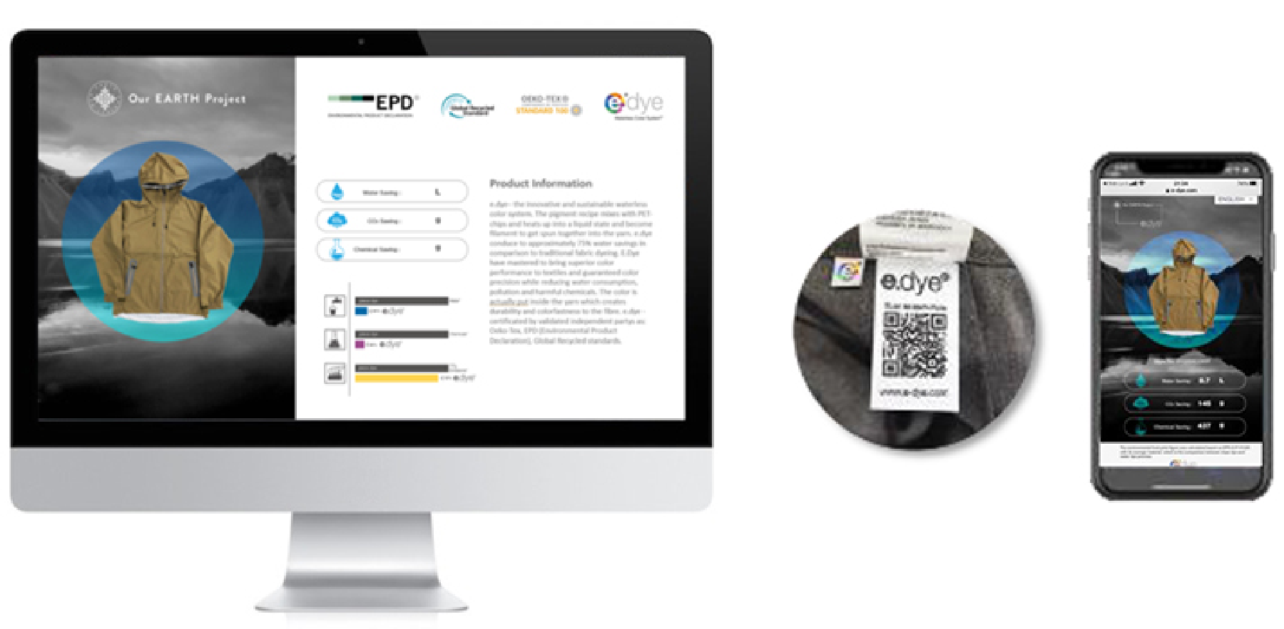 無水染色、すなわち原着技術により、一般的な染色に必要な水の使用量の削減のほか、染色に使用される薬品、染色工程のCO²の排出を抑制します。また、商品のe.dye生地の使用量を基に各種環境負荷軽減度合いを、縫込みラベル等に印刷したQRコードをスキャンすることで確認することができます。